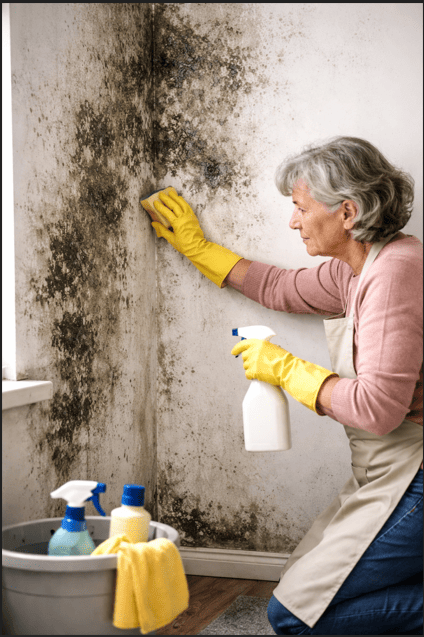 Imagem gerada por chatGPT após pesquisa sobre 'gere uma imagem de uma parede com bolores e uma senhora a limpar a parede'.